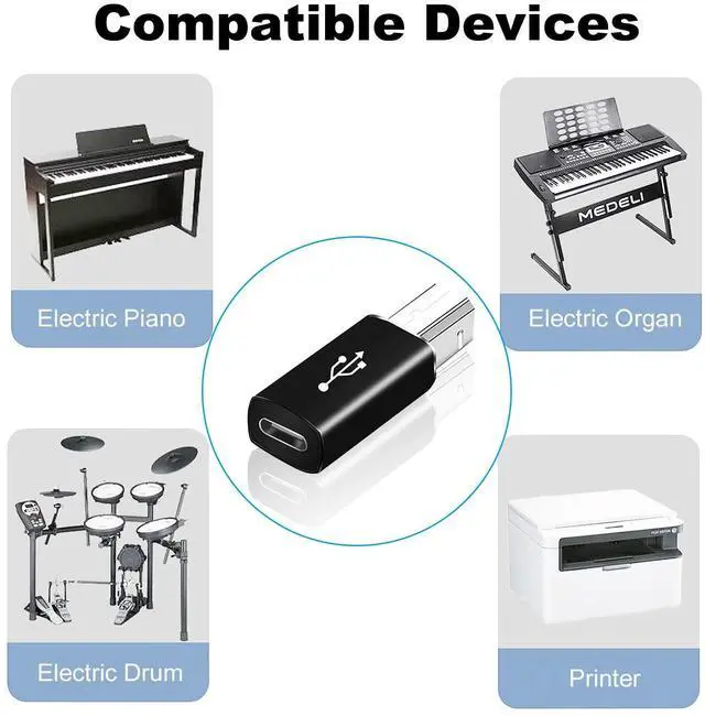 Compatibility For printer, scanner, fax, piano, MIDI, laptop and most USB C devices.