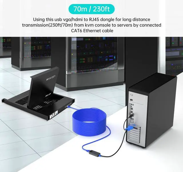 MT-PM01This usb vga to rj45 dongle use for long distance transmission (230ft/70m) from kvm console to servers by connected CAT6 ethernet cable.