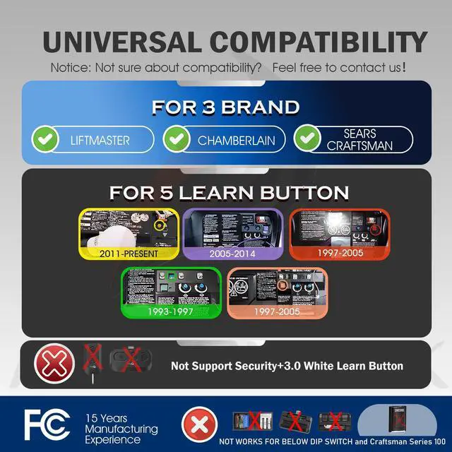 NOT Works for DIP Switch Opener / NOT Compatible with Genie /Overhead Door /Linear /Wayne Dalton /Stanley Openers.