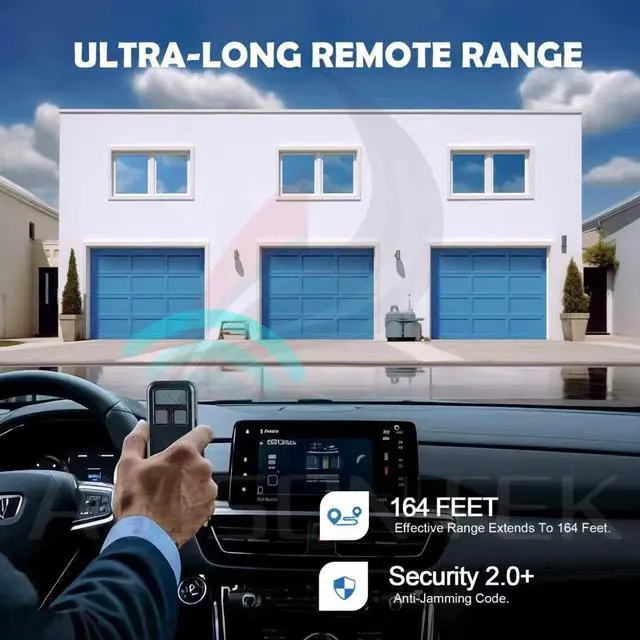 Controls up to 3 Garage Doors in One Device, Over 164 Feet Range for No Waiting Roll-In Access. Security+2.0 Rolling Code Encryption.