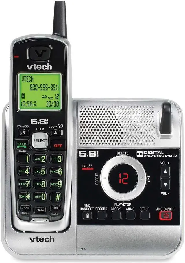 5.8 GHz Cordless Phone features a digital answering machine, Caller ID/Call Waiting and a large display. Caller ID stores 45 calls in name/number memory. Answer system offers 12 minutes of recording time, audible time/date stamp on recorded messages, backlit message counter and remote message retrieval. Wi-Fi-friendly phone system features a 20 name/number phonebook directory, nine-number speed dial, any key answer, backlit keypad and display, handset volume control, last number redial, page/handset locator, and selectable ring times. Trilingual prompts can be displayed in English, Spanish and French. Energy Star qualified.