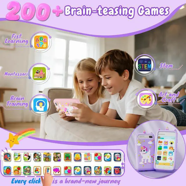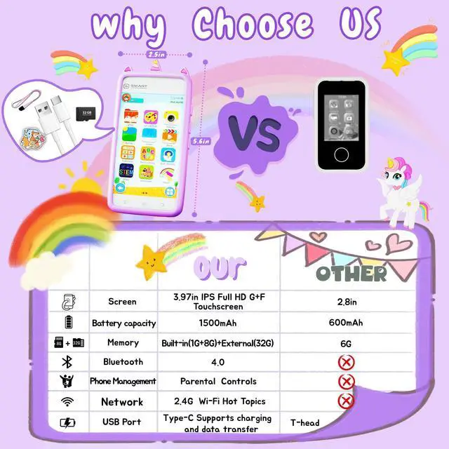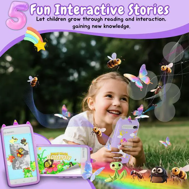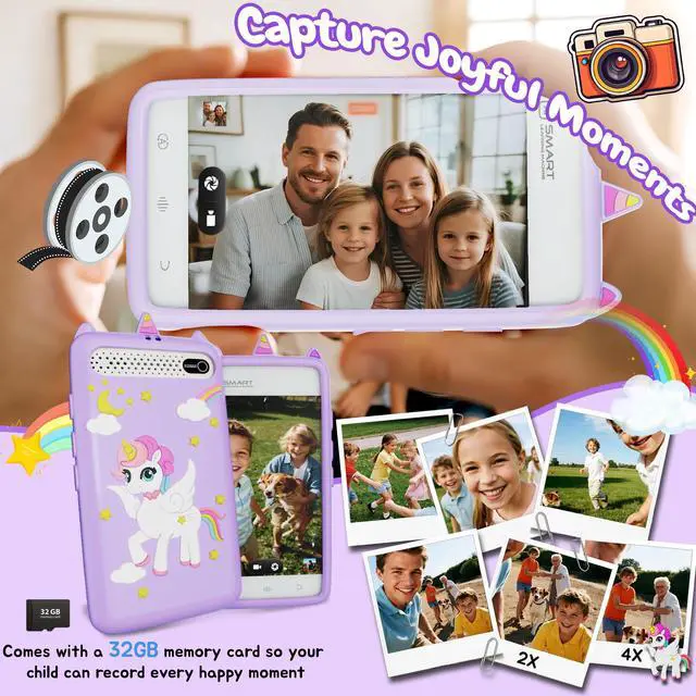Kids-Friendly Design: Our kids' smartphone is perfect for ages 3-10, featuring a 3.97-inch screen that fits small hands. It comes with a fun cartoon pony silicone case thats drop-proof and dust-proof for durability during play. The intuitive user interface and colorful cartoon app icons are engaging for kids. Little ones can easily take photos and videos, and we include 10 cute stickers . They can choose their favorites to capture special moments anytime! Plus, with a 32GB memory card, theres plenty of storage for all their pictures and videos.