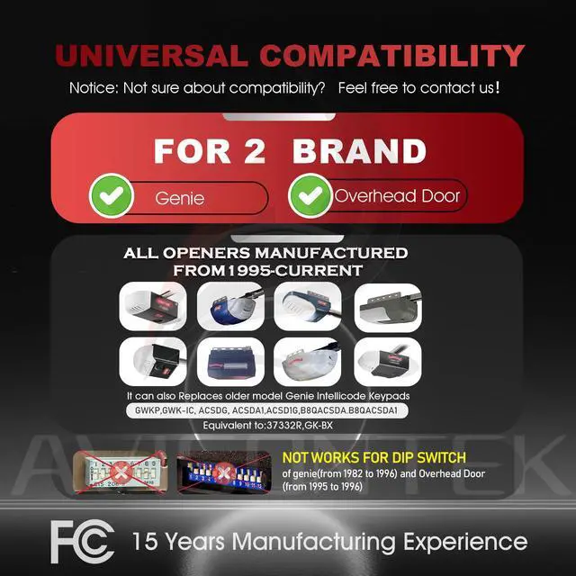 **Compatible List**: Universal for 1995 to Present Overhead Door Legacy Python Odyssey Destiny Phantom Garage Door Opener.Replacement for OKP-BX GK-R GK-BX GWKPD-BL GWK-IC, GWKP, ACSDA1, ACSDG, ACSD1G, B8QACSDA1, B8QACSDA. {Not Support Dip Switch Garage Door Opener!}
