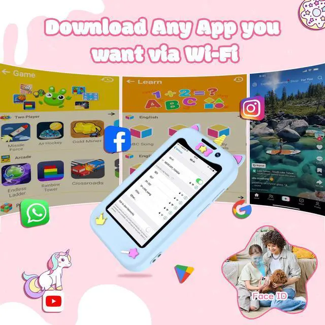 1.Full-Scene Intelligent Networking FunctionSupports WiFi connectivity, enabling free downloads of a wide range of appsincluding puzzle games, educational software, reading tools, video platforms, and popular social apps like TikTok. This kids phone caters to childrens diverse needs for entertainment, learning, and social interaction. Additionally, this mini phone features Bluetooth connectivity for convenient pairing with headphones, ensuring privacy during use and protecting childrens hearing.