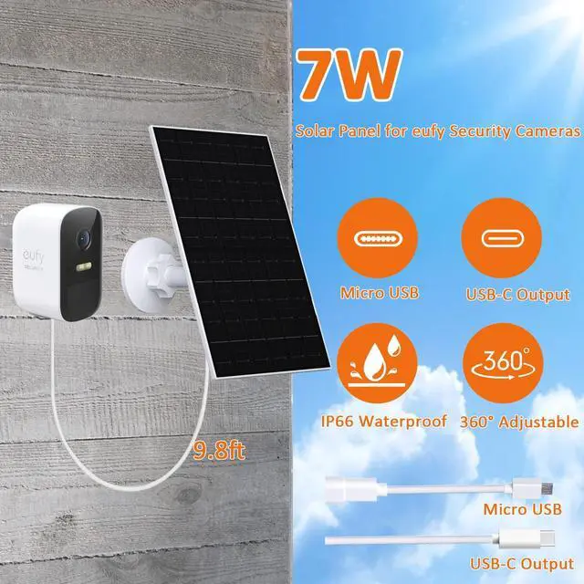 The VUEBEE 7W Solar Panel is compatible with most eufyCam battery-powered cameras (e.g., eufyCam 2, 2C, 2 Pro, 2C Pro, E20, E40, eufyCam 3/3C) and most 5V rechargeable security cameras with USB-C ports, without the included Micro USB adapter.