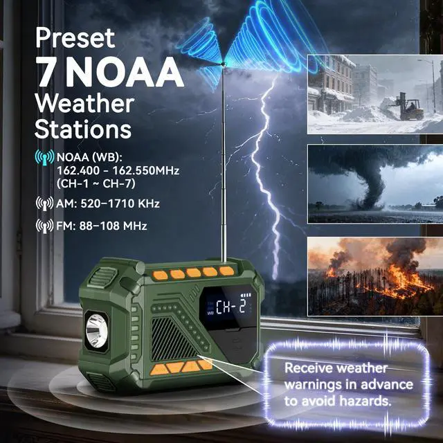 7 Dedicated NOAA WB Channels — Receive official extreme weather alerts (hurricanes, tornadoes, downpours) to avoid risks early.