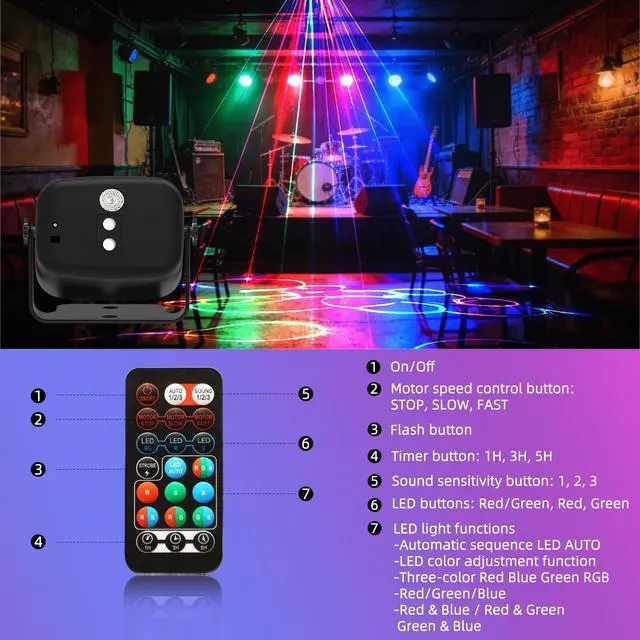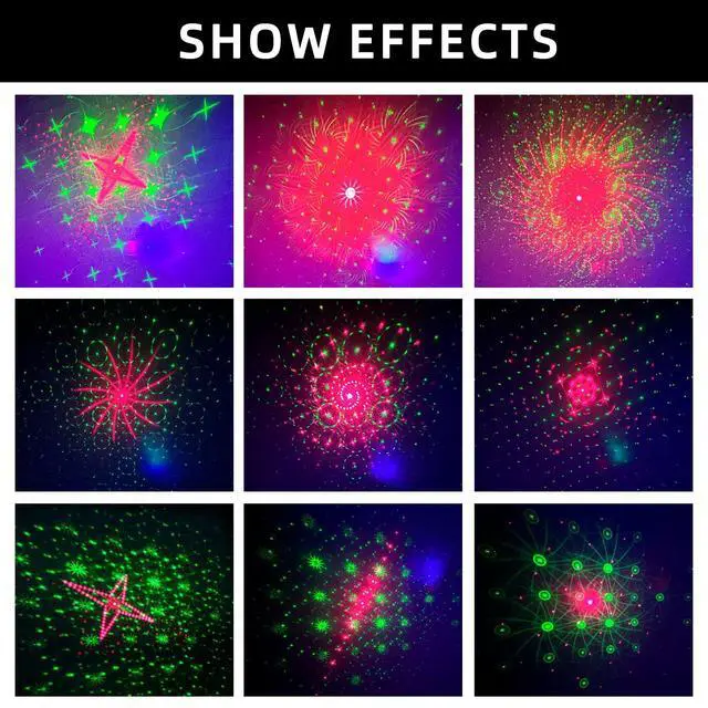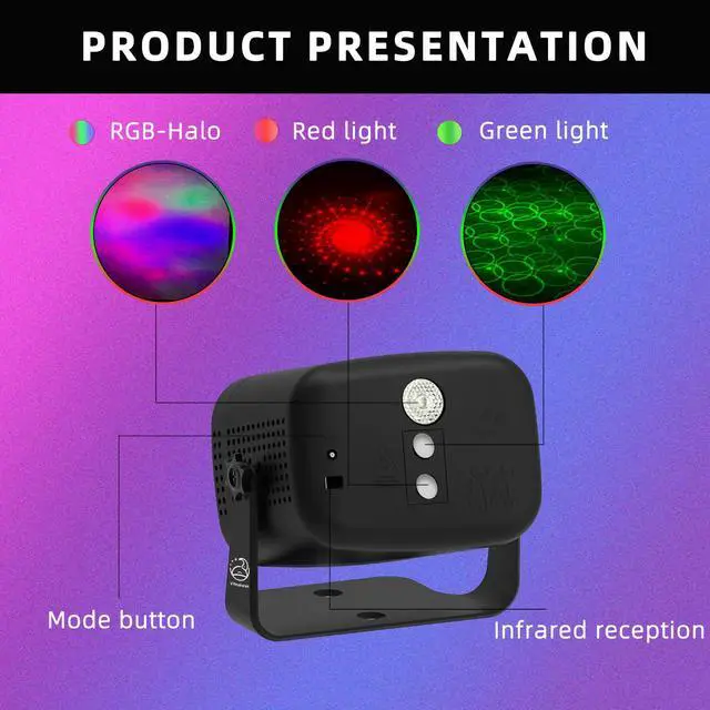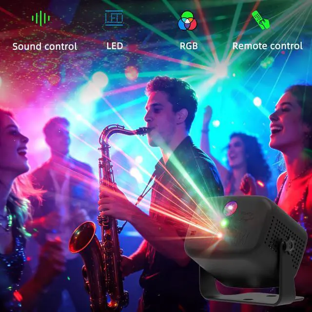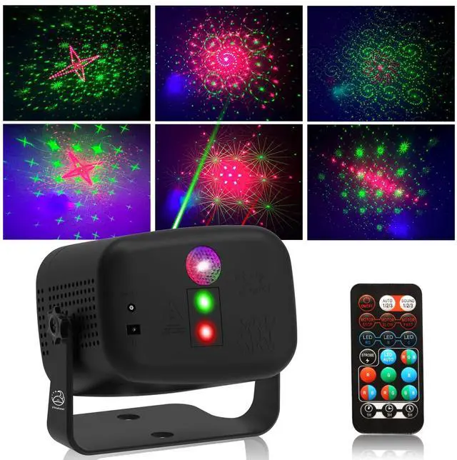 This disco party light is equipped with red & green main lights and an RGB 3-in-1 light source, creating up to 60 lighting effects including Christmas patterns.