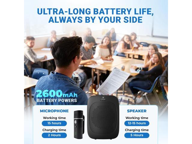 - Marathon Battery LifeSpeak All Day Without Stopping:The portable PA system includes a 2600mAh speaker battery (12hrs runtime) and a 400mAh wireless mic (15hrs runtime),teach, tour, or train without power worries!