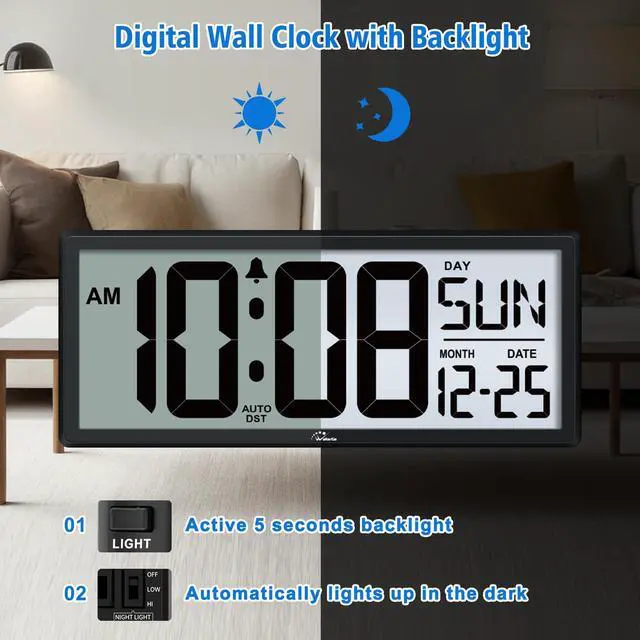 Press LIGHT button on the back to active the backlight on lasts 5 seconds. It is easy to check the time at any time.
