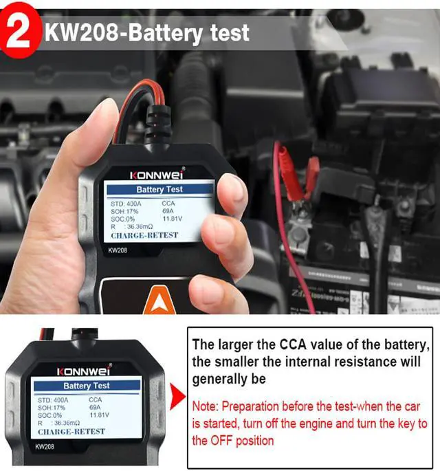 Multi-function in Battery Tester - The KW208 battery tester has functions such as battery testing, starting test, and charging test. The battery test is mainly to analyze and calculate the health status of the battery; Test the actual starting current and starting voltage of the starter motor, which helps to determine whether the starter motor is working properly; The charging test is to check and analyze the charging system to find the output of the generator Is the voltage normal.