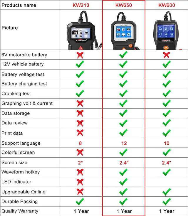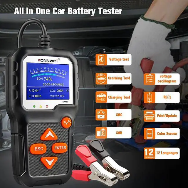 KW650 can test all the 6 volts and 12 volts batteries, wide operating range all the way down to 100 cold-cranking amps and as high as 2000 cold-cranking amps.