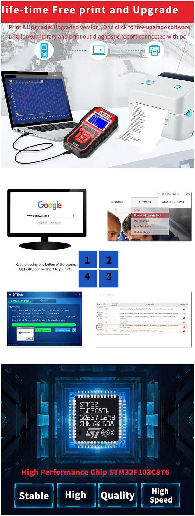 [WHAT YOU GET] KONNWEI KW850 OBDII check engine light code reader offers free storage case, life-time FREE software update service to fix the latest bugs or add newly features which makes it compatible to more vehicles in future (Please note: it CAN NOT be updated on an MAC PC). With a worry-free 36-month and professional technician staying behind, 7*24 at your service!