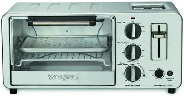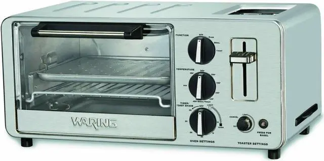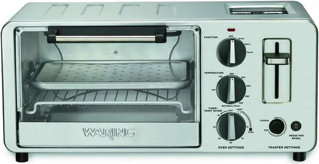 1500-watt 4-slice toaster oven with built-in 2-slice toaster Large 0.45-cubic-foot oven capacity; bake, broil, and toast functions Adjustable temperature; 30-minute timer; light to dark shade settings; "bagel" button Cancel option for stopping at any time; broiling pan and drip tray included Product Built to North American Electrical Standards