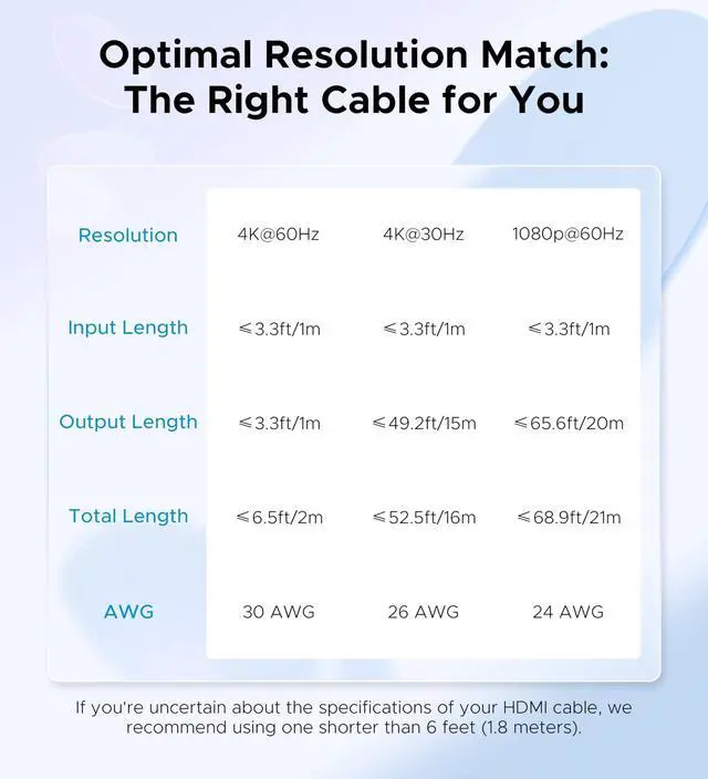 - Since long transmission distance would cause picture degradation, we recommend that the total length of HDMI cable is =3M if you need to get 4K@60hz video connections.