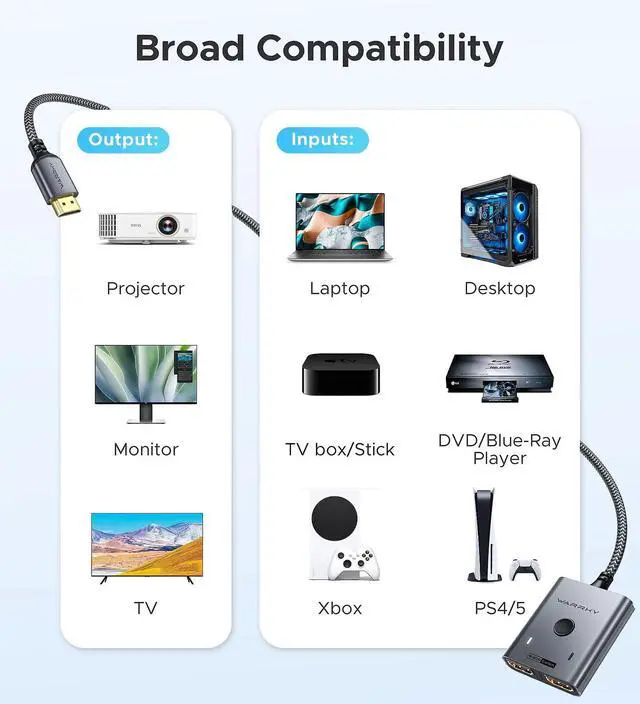![Alt view image 6 of 7 - HDMI Switch 2 in 1 Out 4K@60Hz, [with 3.3ft Fixed Braided HDMI Cable, Aluminum Case, 2K@144Hz, HDCP 2.2] Bidirectional 2x1 Switcher Splitter Compatible for PS5/4, Xbox, Roku, FireStick, Switch](https://c1.neweggimages.com/productimage/nb640/C5TPD2603110SKX05F5.jpg)