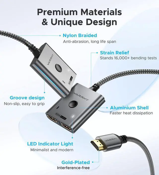 - Fixed HDMI 2.0 high-quality cable. The materials and length of HDMI cable would affect picture quality. WARRKY 3.3ft braided cable combines use experience and display performance. Without picture degradation.