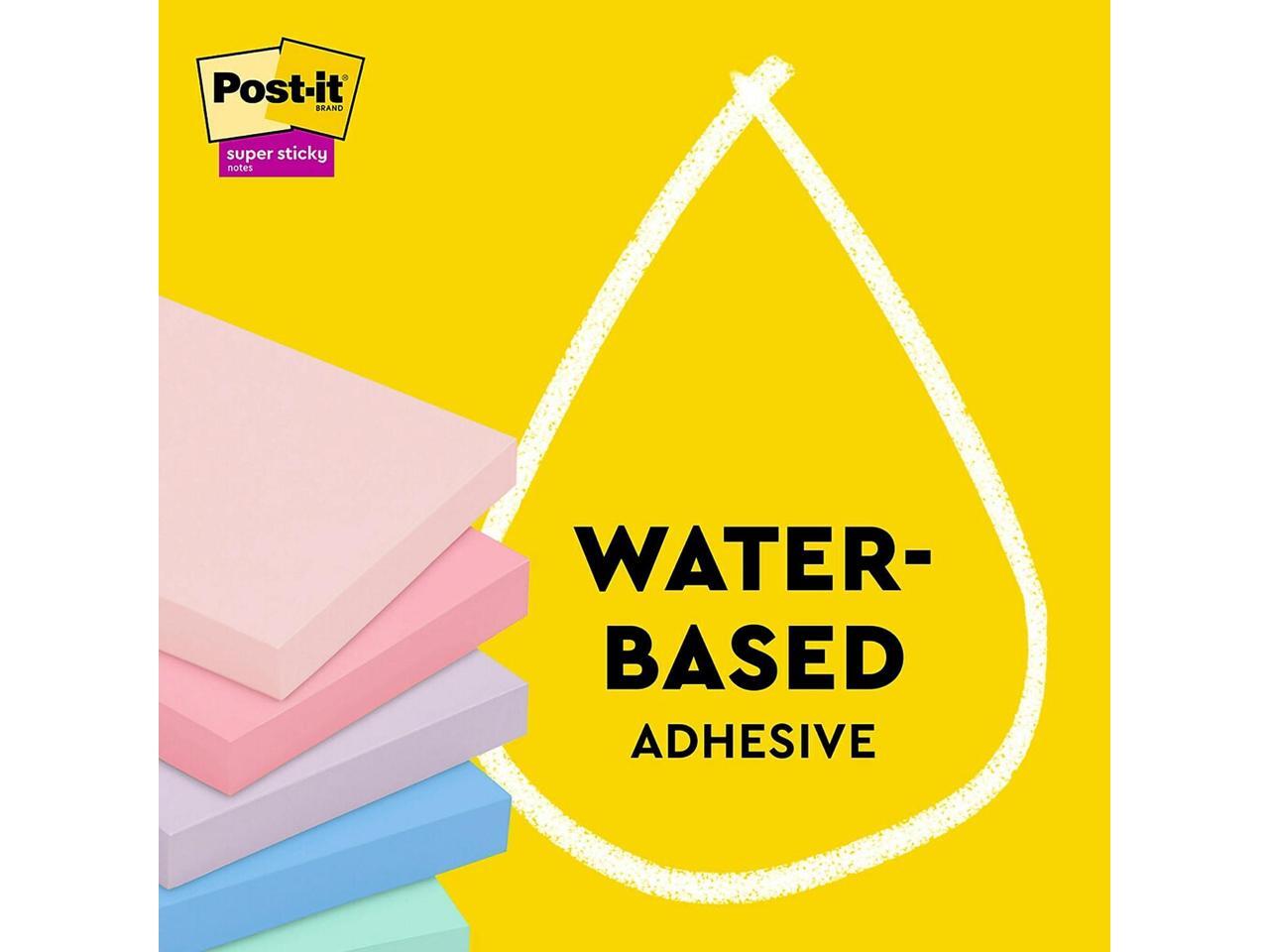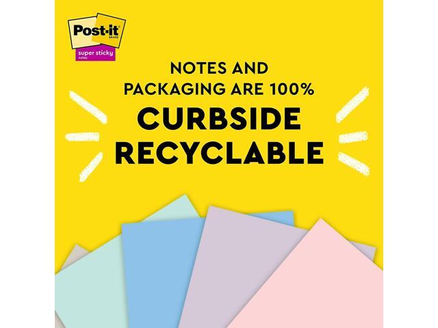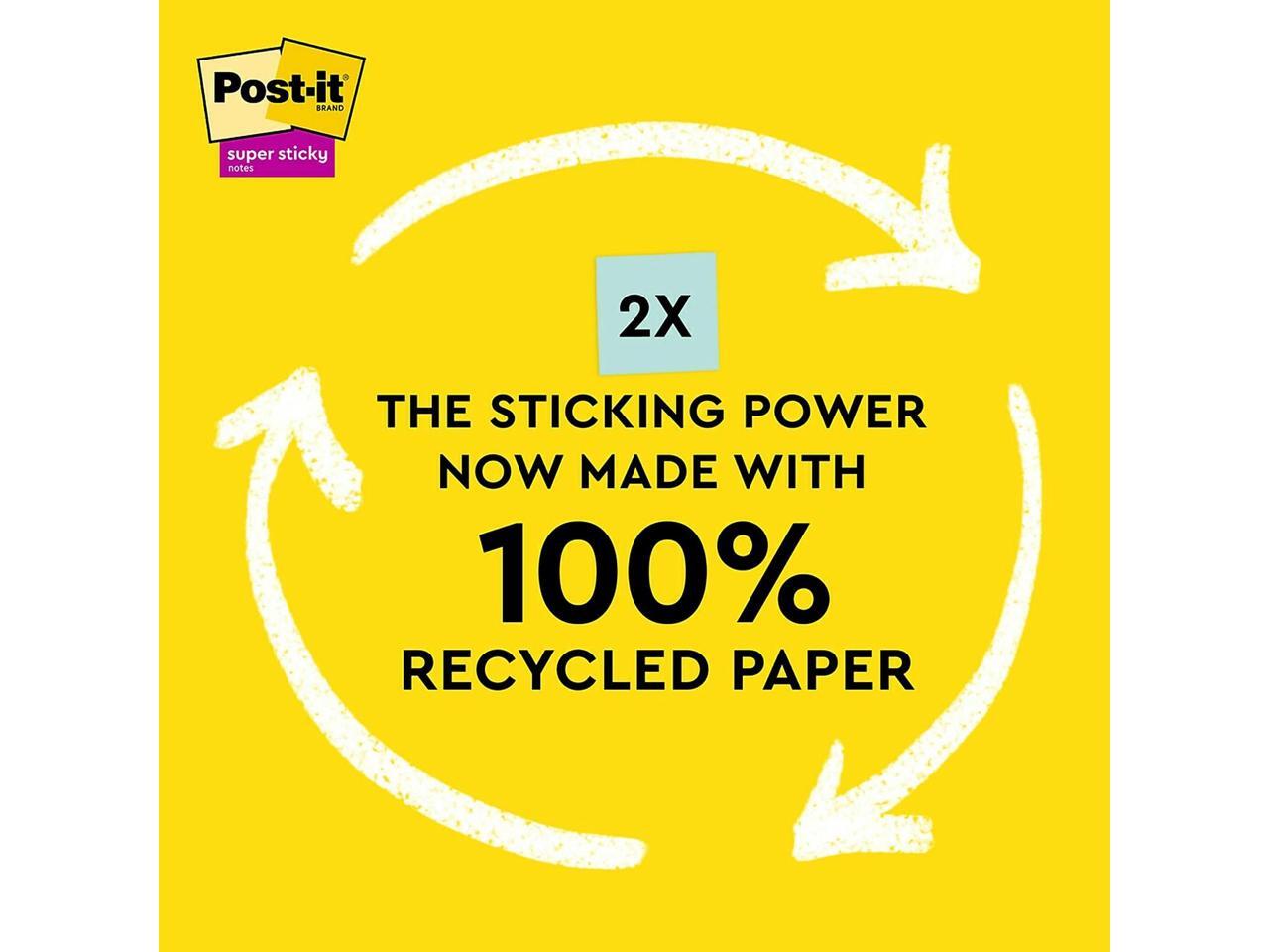 - EXPERIENCE THE POWER OF 2X STICKINESS: Post-it Super Sticky Notes offer twice the sticking power of basic sticky notes using 100% recycled paper. EYE-CATCHING COLORS: Vibrant and colorful reminders are more likely to grab attention and be noticed. SUSTAINABILITY: Post-it Super Sticky Notes can be recycled.