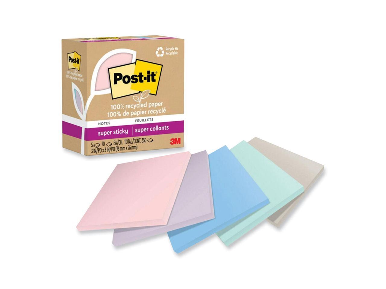- GET ORGANIZED: Each pack includes 5 pads of 3 in. x 3 in. notes, with 70 sheets per pad, great for your office, work area, or classroom, these Post-it 100% Recycled Paper Super Sticky Notes are a 2024 Good Housekeeping Sustainable Innovation Awards Winner. VARIOUS SIZES AND SHAPES: Available in different sizes, with or without lines, to cater to your specific needs. TRUST THE ORIGINAL CREATOR: Made in the USA with globally sourced materials, the one and only Post-it Note was invented over 40 years ago by the Post-it Brand.