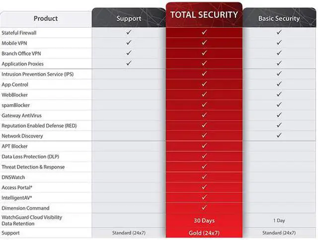 MAIN OVERVIEW FEATURES: Firewall Protection Supported: Denial of Service (DoS),Antivirus,Packet Inspection,Blended Threat Prevention,Stateful Packet Filtering,Proxy Blocking,URL Filtering,Anti-phishing,Firewall Authentication,Secure IPsec VPN Connectivity,Malware Protection,Trojan Horse,Virus Protection,VoIP Attack,Network ProtectionLicense Required: APT Blocker,Data Loss Prevention,Threat Protection,Application Control,WebBlocker,Anti-spam,Gateway Antivirus,Intrusion Prevention,Reputation Enabled Defense (RED)Encryption Standard: RSA,DES,SHA-2,AES (128-bit),AES (256-bit),3DESTotal Number of Ports: 3USB: YesNumber of Network (RJ-45) Ports: 3Ethernet Technology: Gigabit EthernetNetwork Standard: 10/100/1000Base-TWireless LAN: YesWireless LAN Standard: IEEE 802.11b/g/nManageable: YesHeight: 1.3"Width: 6"Depth: 7.5"Environmentally Friendly: YesEnvironmental Certification: REACH,RoHS,WEEELimited Warranty: 1 YearSupport/Service Duration: 3 Year Total Security Suite