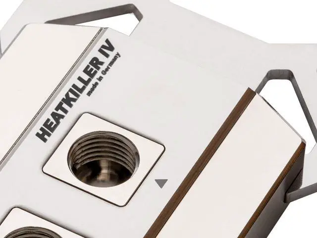 The focus of innovation was the new cooling structure. Finer micro fins greatly enlarge the contact surface of cooling liquid and cooler. Flow characteristics became optimised as well. These changes increased the cooling performance by up to 3°C compared to the predecessor. The flow efficiency benefits too supported by large-volume receptacles. The HEATKILLER® IV features a real high flow design, making it perfectly suitable also for lower performing pumps.