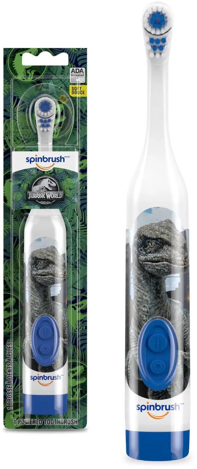 Brushing with dinosaurs is a prehistoric adventure for ages 3 and up with the Jurassic World Spinbrush electric toothbrush; kids brush 38% longer with Spinbrush vs. a manual kids toothbrush