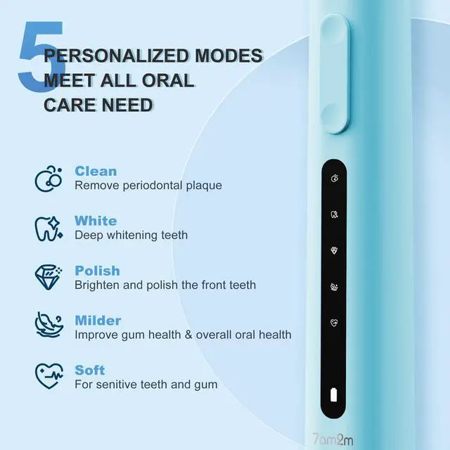 5 Clean Modes - Electric toothbrush with 5 modes for adults and kids. Clean(gentle), White(strong), Polish(strong invert frequency), Milder(gentle invert frequency) and Sensitive(soft) to suit different conditions of teeth of gums, so you can choose different modes according to your preferences and dentist's recommendations.