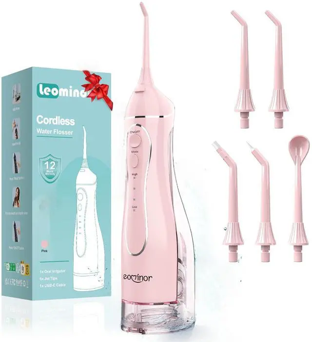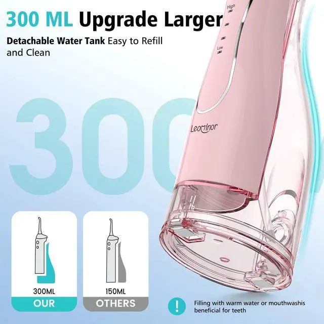 Leominor Water Flosser Pick for Teeth, 300ML Portable Oral Irrigator Upgraded Tank Removable,IPX7 Waterproof, Rechargeable Travel Teeth Cleaner, Professional Electric Flossing Machine (Pink)