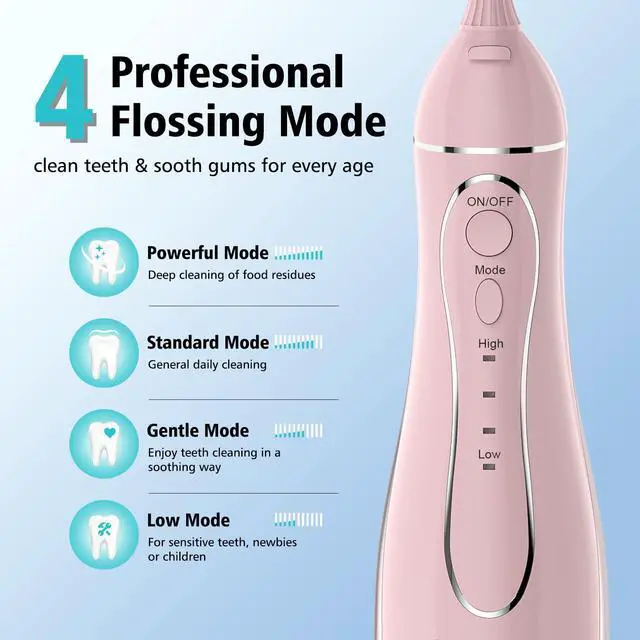 Deep Clean, Improve Gum Health, Freshen Breath The Leominor water dental flosser, With upgraded unique pulsation technique, the water flosser has 4 cleaning modes with a 0.75mm powerful water stream and up to 1400 high-pressure water pulses to remove 99.9% food residues hidden deep in the mouth, massage the gum effectively and promoting blood circulation. and addresses oral issues like bad breath, orthodontic teeth brace and bridge care. The travel teeth flosser has offer a pressure range of 50-150PSI strong water press making it suitable for sensitive teeth and meeting various oral care needs for different groups of people, including kids and the elderly.