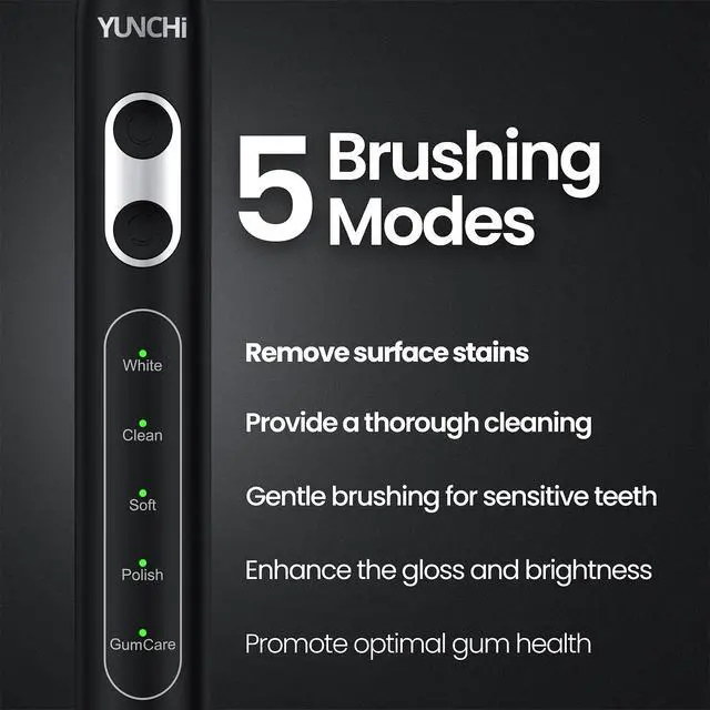 5 Cleaning Modes Tailored for Every Need This sonic black electric toothbrush features 5 customized modes- White, Clean, Soft, Polish, and Gum Care- to suit every oral care need. Whether you're targeting plaque removal, gum sensitivity, or need an electric toothbrush for braces, this brush adapts to your unique dental condition