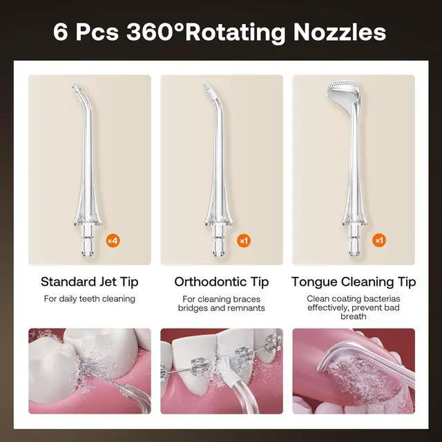 6 Replacement Tips and 360° Reach Every Corner: With multiple nozzle types catering to diverse family needs. Its 360° rotary tips can easily clean areas, while the orthodontic and tongue cleaning tips provide specialized care