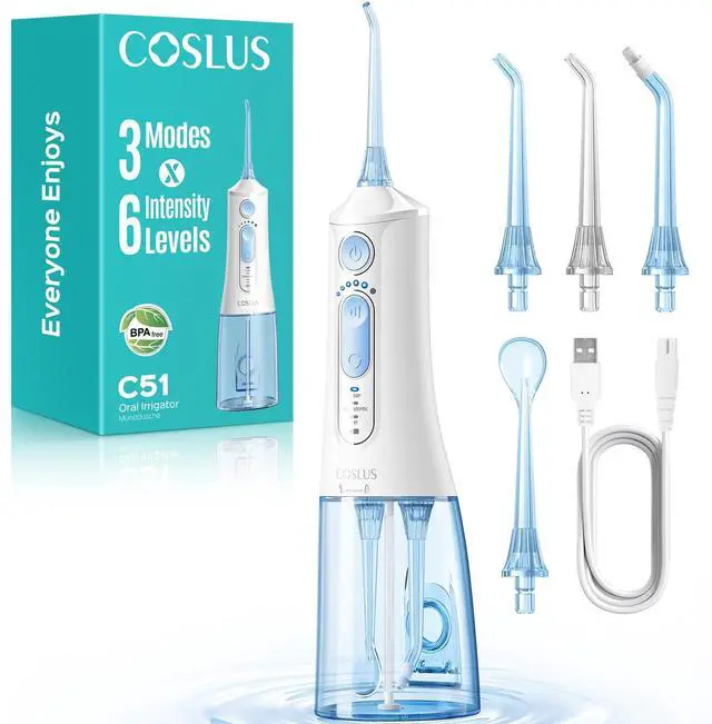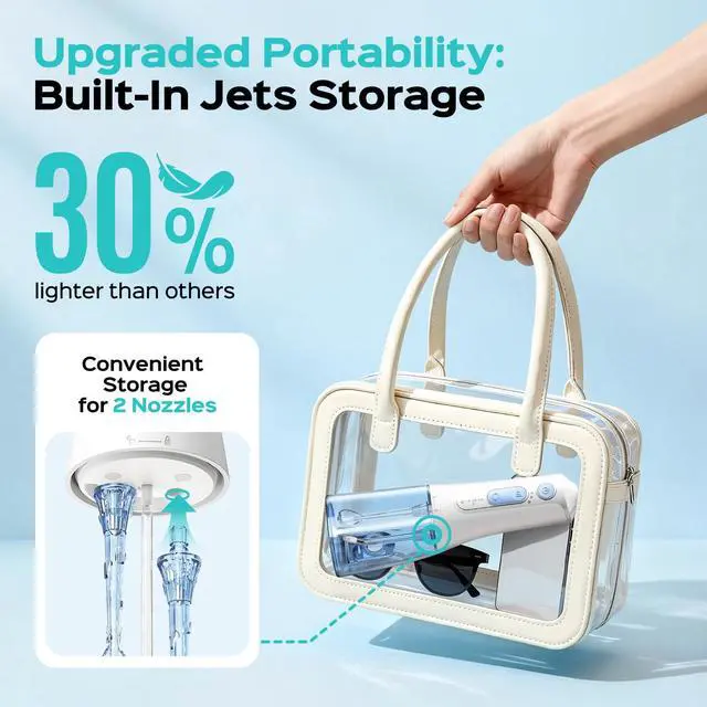 Cordless water flosser is highly portable. The compact, lightweight design features built-in nozzle storage, eliminating the need for a separate case. It is easily packed in a backpack or suitcase for travel.