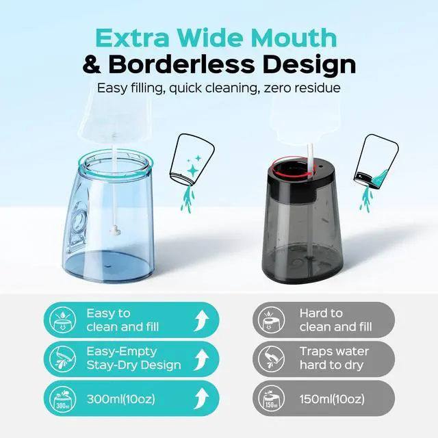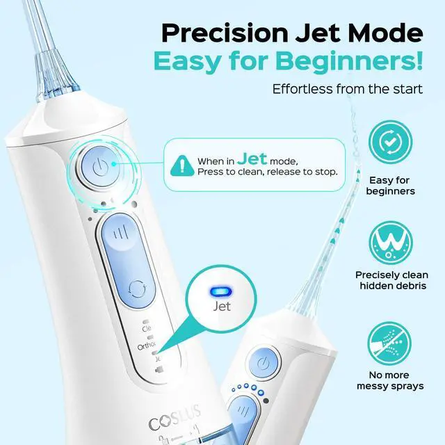 Simply choose the mode button to select Jet mode. The water dental pick features a press to clean and press to stop function, allowing for controlled and minimized splashing, and it is suitable for beginners.