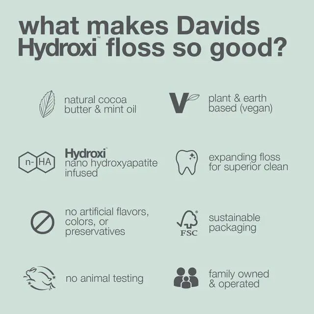 ![]() Davids Expanding Floss | ![]() Floss Refills | ![]() Davids Hydroxi 4oz | ![]() Tongue Scraper | ![]() Bamboo Toothbrushes | ![]() Hydroxi Orange Vanilla | ![]() Mild Mint 5.25oz. |