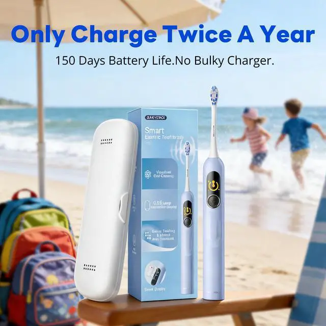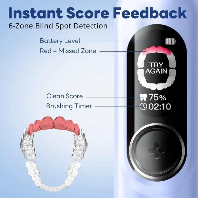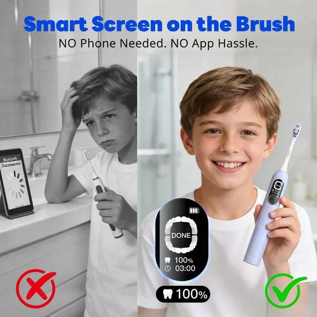 • GAMIFY THEIR ROUTINE: INSTANT 0%-100% SCORE. Stop the morning nagging! The built-in Smart Screen turns brushing into a fun challenge. It instantly displays a Brushing Score and marks Missed Zones in red right on the handle. Unlike other smart brushes, no phone app is neededkids get immediate feedback to correct their habits independently, giving parents peace of mind without handing over a smartphone.
