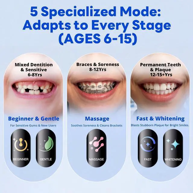 • GENTLE ON GUMS, TOUGH ON SUGAR. We use premium, end-rounded Soft Dupont Bristles that are safe for developing teeth and sensitive gums. Features 5 Cleaning Modes (including a Gentle Mode for beginners or sore teeth after braces tightening), providing a customized clean that never hurts.