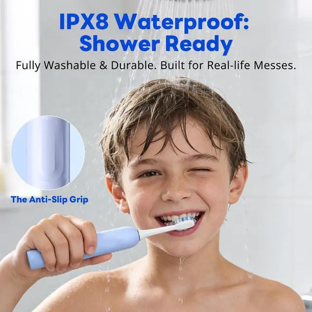 • CAMP-READY: 150 DAYS ON ONE CHARGE. Forget the charger! With an industry-leading battery life, one charge lasts up to 5 months. Its perfect for summer camps, sleepovers, or messy countertops. Plus, its IPX8 Waterproof, so your child can brush in the shower without worrying about water damage.