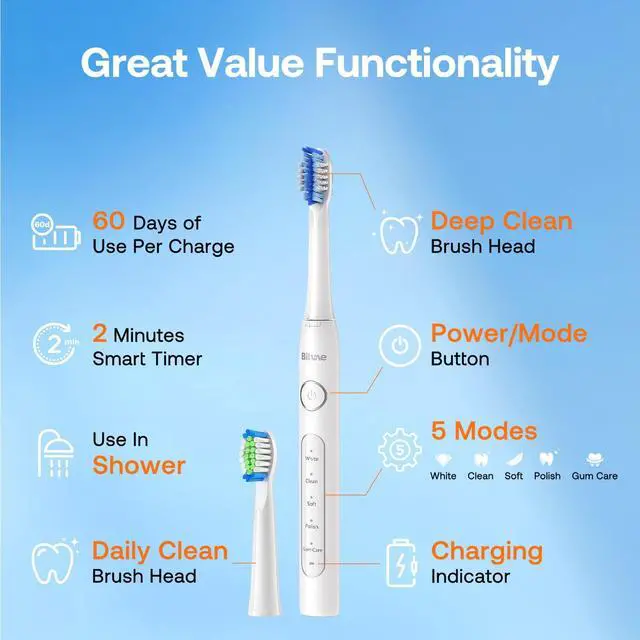 Endorsed by the American Dental Association (ADA) Council on Scientific Affairs, the Bitvae D2 Electric Toothbrush provides a brighter smile in just two weeks. Its 2-in-1 holder and cover ensure toothbrush clean, while the slim and lightweight design makes it the perfect travel companion with a 60-day battery life. With 8 replacement heads for two years of use, you can by more toothbrush heads in Bitvae Store. Including precision firm bristles and soft gumcare bristles, this toothbrush provides deep cleansing and gum protection. Offering 5 modes for various oral care needs and a 2-minute smart timer, the Bitvae D2 ensures a healthy mouth with every use. Built with IPX7 waterproof technology, this toothbrush is shower-safe, making it ideal for travel, including air travel. Experience innovation and excellence with this durable electric toothbrush, providing an impeccable oral care experience anytime, anywhere.