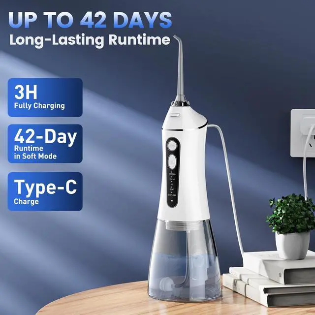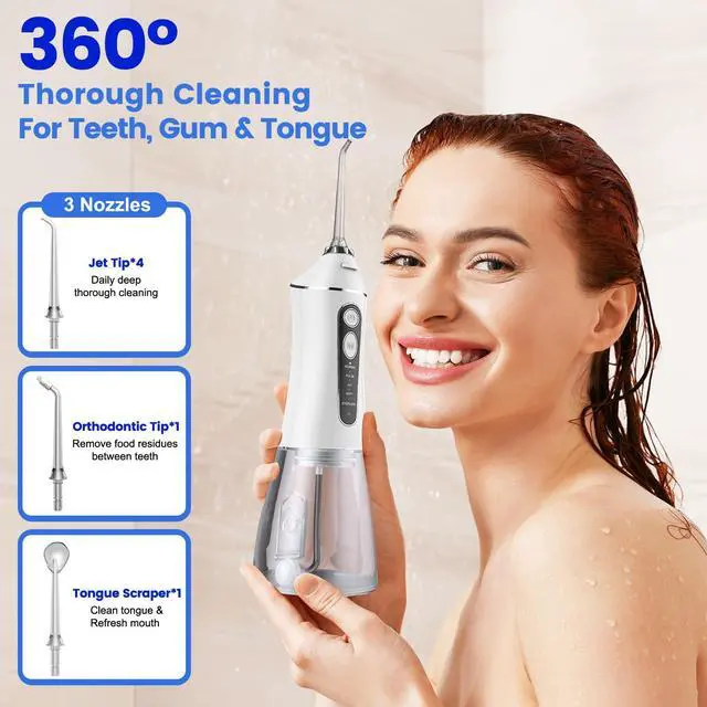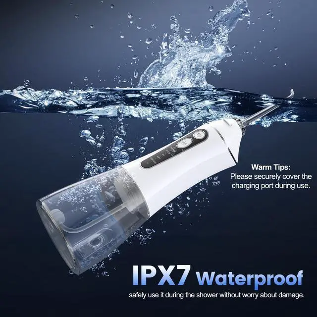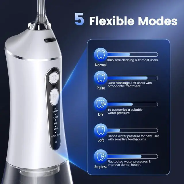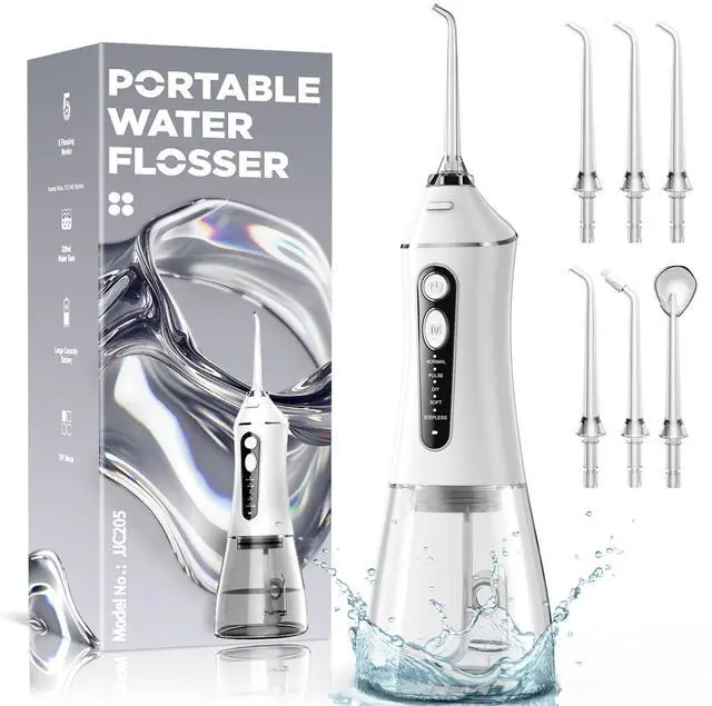 Experience a new level of oral hygiene with our Portable Water Dental Flosser. Featuring a 0.6mm precision water spout, our dental flosser deeply cleans between teeth, effortlessly removing plaque and food debris while promoting healthy gums. Powered by advanced high-frequency pulse technology at 1500±50 pulses per minute, it offers adjustable water pressure from 60 to 200 psi, catering to all your dental cleaning needs. With five modes including Normal, Pulse, DIY, Soft, and Stepless modes, you can customize your cleaning experience for maximum comfort. Ideal for travel, this rechargeable flosser is compact and runs for up to 42 days on a single three-hour charge in soft mode. The 320ml large tank means fewer refills, while the 360° rotating flosser head and six replaceable nozzles, including a tongue scraper, ensure thorough cleaning in hard-to-reach areas. Plus, with an IPX7 waterproof rating, its safe to rinse under water, making it a practical choice for home or on the go. Elevate your dental care routine with our Portable Water Dental Flosser from now on! You own a thoughtful home dentist.