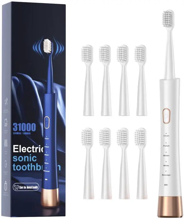 High Vibration Sonic Electric Toothbrush for Adults with 2 Minutes Smart Timer, Fast Charge Lasts Long, 5 Optional Modes, 8 Replacement Brush Heads Ultra Whitening, White