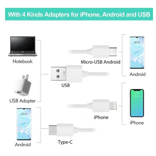 Conveniently powered by 4 types of adapters for iPhone/Micro-USB Android/USB.