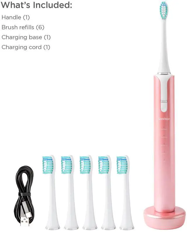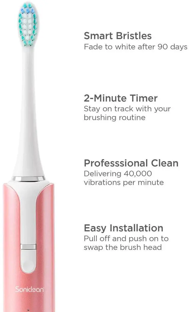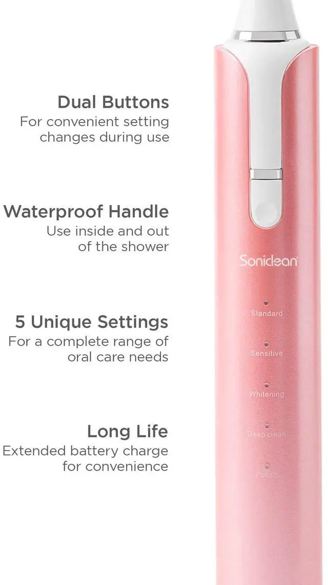 The Lux series features five unique cleaning modes to help customize your personal care routine: standard, whitening, sensitive, deep clean, and polish. At 40,000 vibrations per minute, the soft bristles help to clean, polish, and whiten teeth with every use while remaining gentle enough for sensitive gums. A smart 2-minute timer reminds you to brush for the dentist-recommended time every morning and evening. With additional features like a waterproof handle and ultra long-lasting battery life, the Lux series sonic toothbrush delivers a professional grade clean from the comfort of your home. The included toothbrush replacement heads feature smart bristles that fade from blue to white, reminding you when it's time to replace them. Take the guesswork out of your oral care and start smiling with confidence with Soniclean.