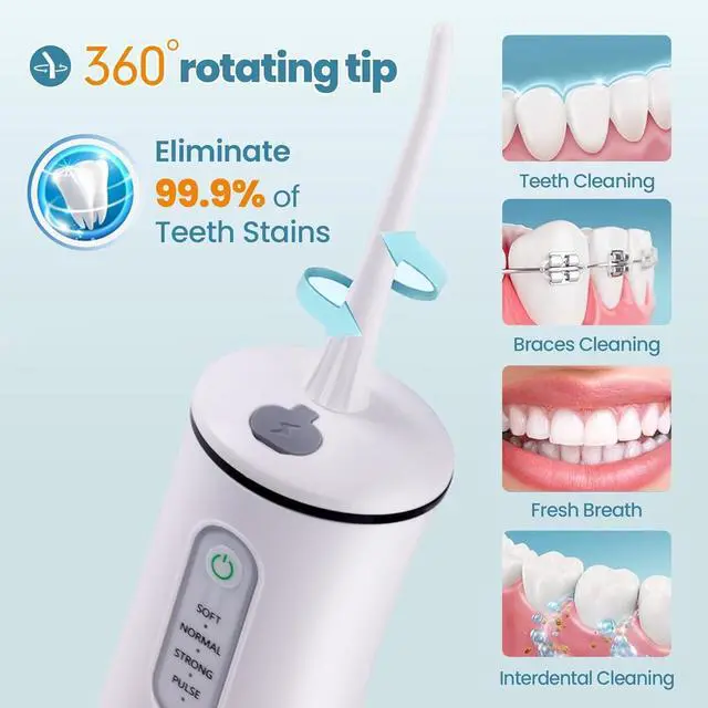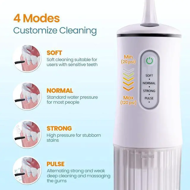 - Experience superior oral care with this advanced water flosser featuring 4 specialized cleaning modes: Soft , Normal , Strong,Pulse.