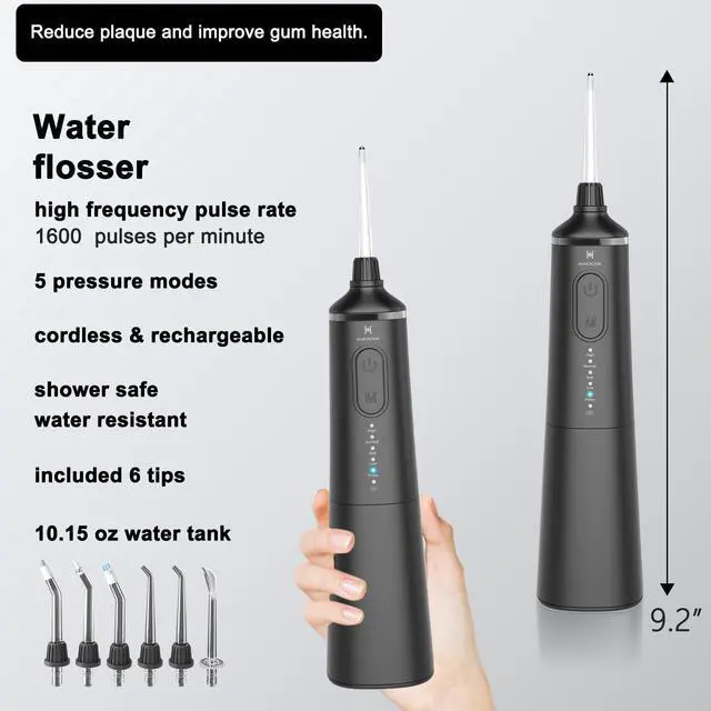 Smart Design with Expanded FunctionalityOur upgraded flosser boasts a 300ml reservoir (50% larger than entry-level kits) for uninterrupted cleaning sessions, complemented by optimized pulse technology that removes 99.9% of biofilm. The redesigned ergonomic handle features non-slip grip patterns and gold-accented controls, while the waterproof construction exceeds IPX7 standards through reinforced sealing technology.