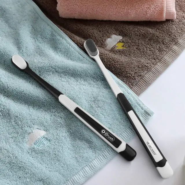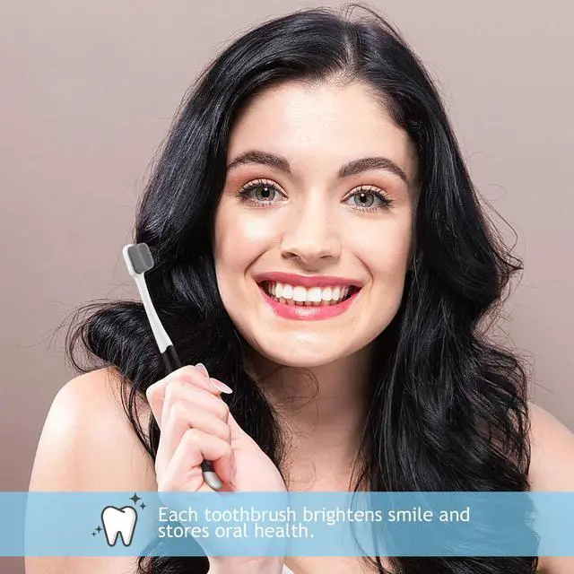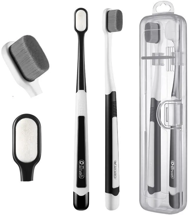 Utilizing advanced nano technology from Japan, our toothbrush bristles are exceptionally thin and soft, measuring only 0.08mm in thickness. This makes them much thinner and softer than regular toothbrush bristles (0.12mm), providing a gentle massage to the gums and delivering a soothing oral care experience. DEEP CLEANSING - The soft bristles are densely packed, with 20 times more bristles than a regular toothbrush. This allows for more bristles to reach into inter-dental spaces and hard-to-reach areas, effectively removing plaque. GENTLE ORAL CARE - If you suffer from sore or bleeding gums, our toothbrush is an ideal choice for your daily oral care routine. It is highly effective for sensitive teeth and gums, making it suitable for individuals such as pregnant women and the elderly. COMFORTABLE GRIP - The handle features an ergonomically designed thumb grip, ensuring a comfortable brushing experience. It also has a tongue and cheek cleaner on the back of the brush head for added oral hygiene. PORTABLE TRAVEL CASE - Our twin pack toothbrushes come with a convenient travel case, allowing you to easily carry them with you or store them in the bathroom.