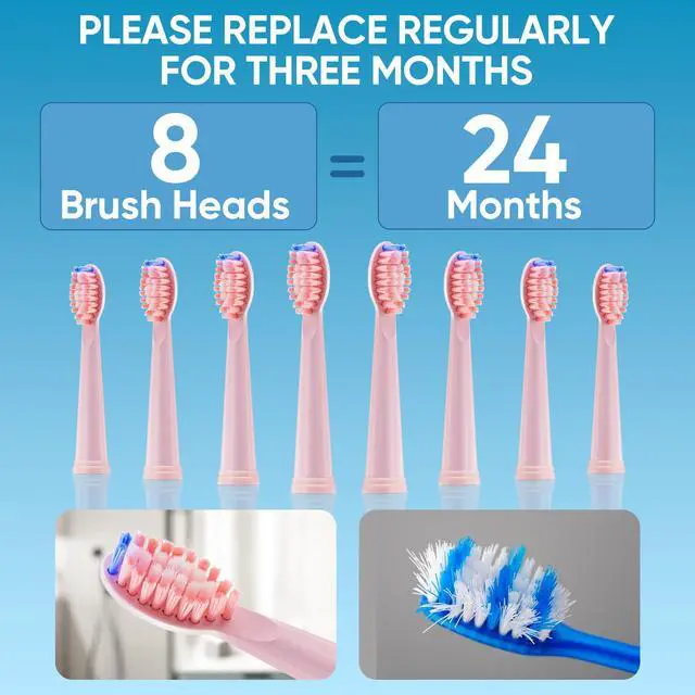 Quick Switch-Off & 24+ Months of Replacement Heads: Press and hold the switch to turn off quickly (no need to cycle through modes); comes with 8 high-quality brush heads (3-month recommended cycle) for over 2 years of use, saving time and money