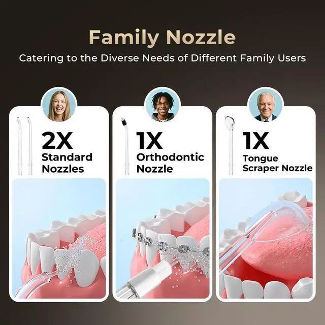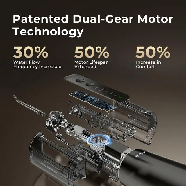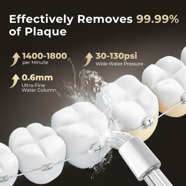 This lightweight water flosser weighs just 0.53 pounds, making it easy for seniors to handle. Featuring dual-gear synergy technology for precise water pressure regulation, it is ideal for those with sensitive gums and thoroughly cleans hard-to-reach areas around dental implants and dentures.