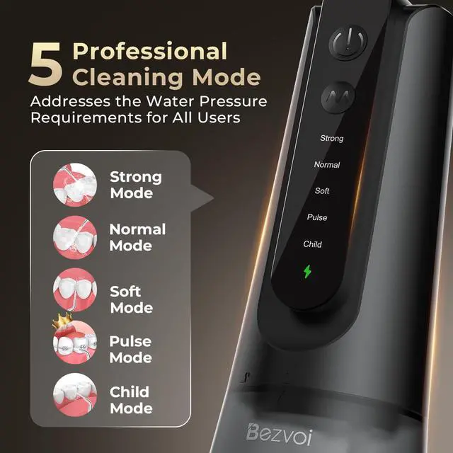Child Mode: Initial adaptation to water pressure; Soft Mode: For sensitive gums; Pulse Mode: for gum massage, periodontal care & dental implants users; Normal Mode: For daily oral care; Storng: For removing food debris from orthodontic brackets.