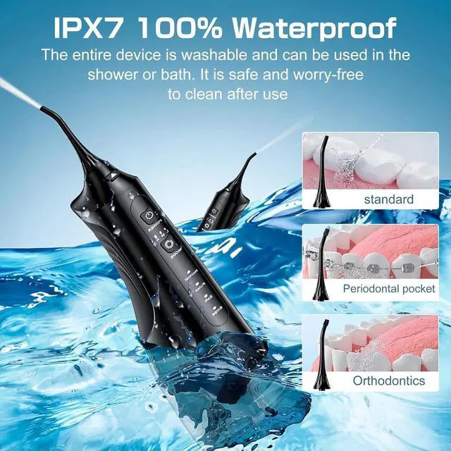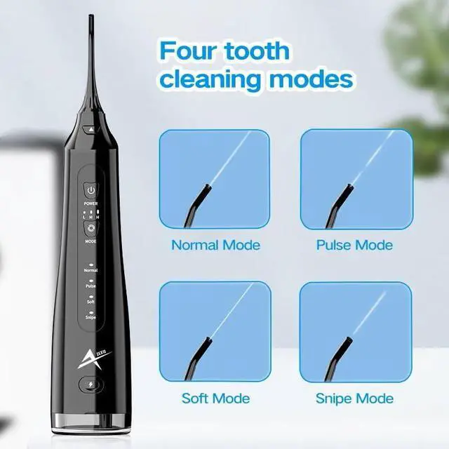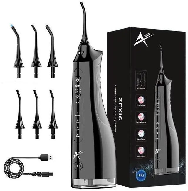 The ZEXIS ZX-300 Water Dental Flosser is a professional-grade oral irrigator and a plaque remover for teeth designed to elevate your dental hygiene routine with an effective, deep clean for teeth & gums. Equipped with 6 specialized nozzles, including orthodontic and periodontal tips, it addresses various dental needs, making it ideal for users with braces or sensitive gums. With 4 flossing modes (Normal, Soft, Pulse, and Point), the ZX-300 provides customizable options to ensure a comfortable and thorough cleaning experience. Its 310mL large-capacity water tank offers continuous water flow without the need for frequent refills, while the IPX7 waterproof rating makes it shower-safe and easy to clean. The rechargeable and cordless design is compact and portable, perfect for both home and travel use. Sleek and modern in black, the ZEXIS ZX-300 is the ultimate companion for a healthier smile and fresher breath wherever you are.