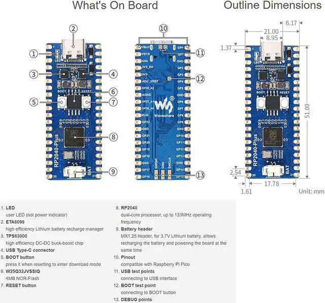 Waveshare RP2040-Plus MCU board based on Raspberry Pi RP2040 microcontroller, with dual-core Arm Cortex M0+ processor running up to 133 MHz, and 26x multi-function GPIO pins^^264KB of SRAM, and 4MB of on-board Flash memory^^Onboard USB-C connector, Lithium battery recharge/discharge header, and DC-DC chip TPS63000, high efficiency DC-DC buck-boost chip, 1.8A current switch^^26 × multi-function GPIO pins, configurable pin function, allows flexible development and integration^^Support C/C++MicroPython, comprehensive SDK, dev resources, tutorials to help you easily get started