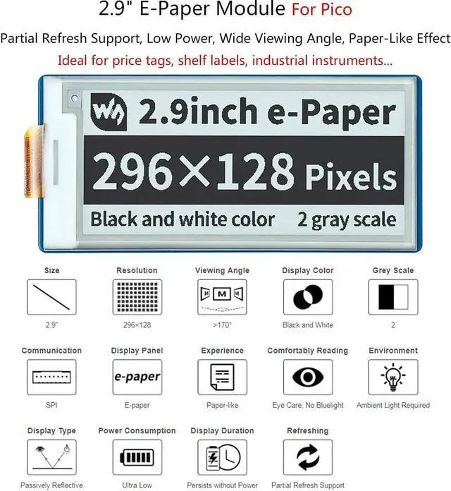 Ultra low power consumption, basically power is only required for refreshing. SPI interface, requires minimal IO pins